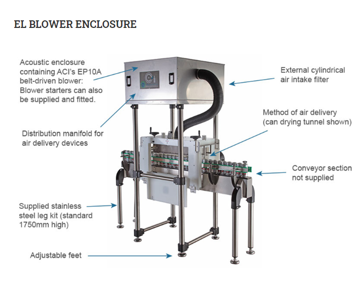 This is a semi-enclosed, cost-effective unit that is easily installed over existing production lines by the end-user. The centrifugal blower supplied (typically ACI’s EP10A compact blower) is contained within a 304 Stainless Steel Enclosure which in turn is attached to a 304 Stainless Steel leg kit that is easily positioned either to the side of, or directly above any conveyor / filling line.